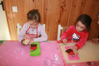 Eramos muchas!!!pero no os lo creáis,las niñas solo jugaban!!!y aparecieron de la nada,pidiendo "pintar galetes"como dice mi peque,jeje!!así que las dejamos hacer dos a cada una y así volvimos a estar solitas las mayores haciendo galletitas!!!
